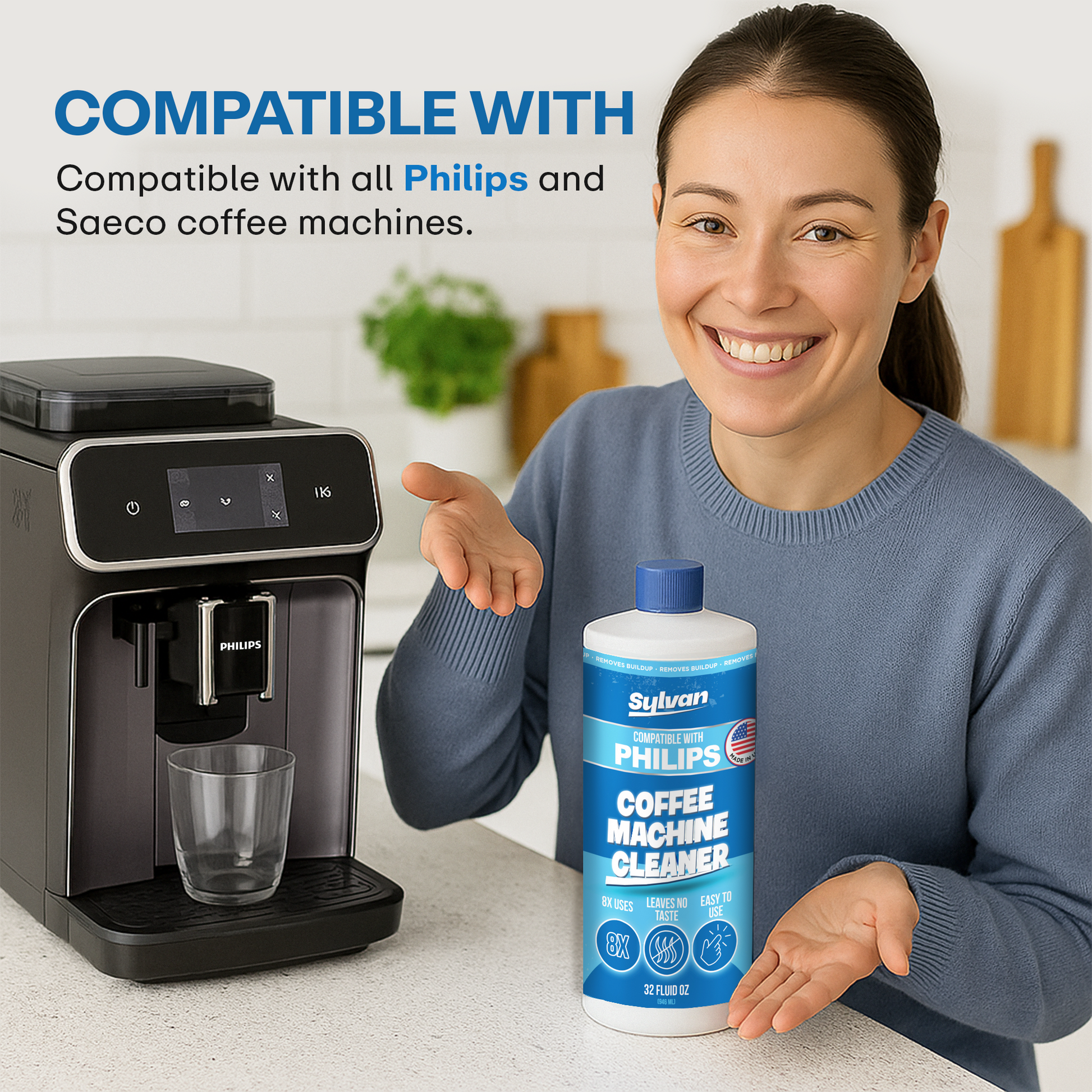 Coffee Machine Cleaner (32 Oz.) - Compatible with Philips Saeco + Free Barista Cloth